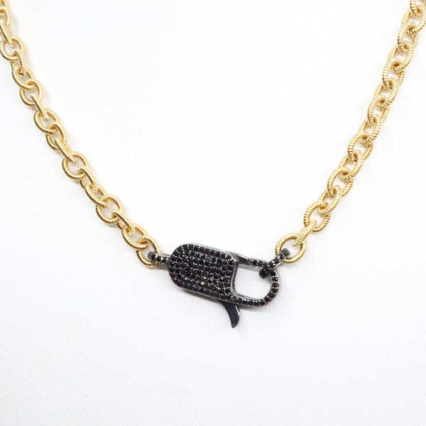 16” total length, black spinel pavé lock is 7/8th x 3/8th on a multi-plated gold mini Industrial chain.