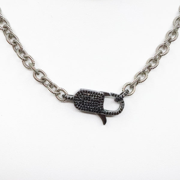 16” total length, black spinel pavé lock on oxidized sterling silver is 7/8th x 3/8th on a multi-plated silver mini industrial chain.