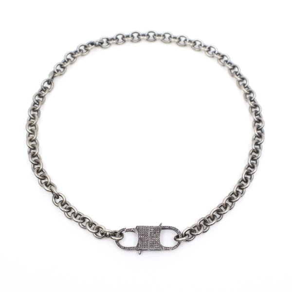 The Bigger the Better. Oversized pavé diamond oxidized sterling fisheye lock on industrial silver-plated chain is perfect for adding charms from your collection.
