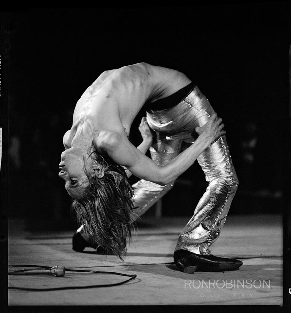 In 1972, Iggy Pop set up camp in London at the urging of his new manager who was introduced to him by David Bowie. After a fruitless search for a new backing band, Mr. Pop re-formed the recently broken up Stooges and put on a single show at the King’s Cross Cinema. This classic image was discovered along with a treasure trove of other photos from the gig during the editing process for Alec’s book, LONDON ROCK: The Unseen Archive (Insight Editions).
