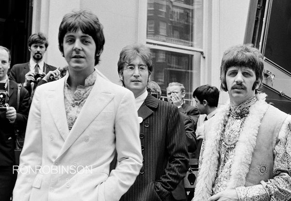 In June, 1967, three weeks after the release of the Sgt. Pepper’s album, the Beatles took part in the very first worldwide live-via-satellite TV broadcast. Called Our World, the show featured segments from 19 countries and was seen by an estimated 700 million people around the globe. Instead of performing a track from their new LP, the lads played a new song, “All You Need is Love” with help from a live 13-piece orchestra and a few friends including Mick Jagger, Eric Clapton, Keith Richards, Keith Moon, Graham Nash and Pattie Boyd. The day before the show, which was broadcast from Abbey Road studios, the group appeared for a photo call attended by dozens of photographers eager to take advantage of a rare chance to shoot the band during a new career high.